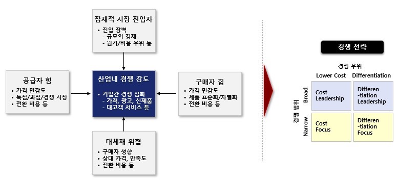 포터의 경쟁 전략은 이러한 외부 환경 분석을 바탕으로 기업이 내부적으로 선택할 수 있는 전략적 접근 방식을 제시합니다.