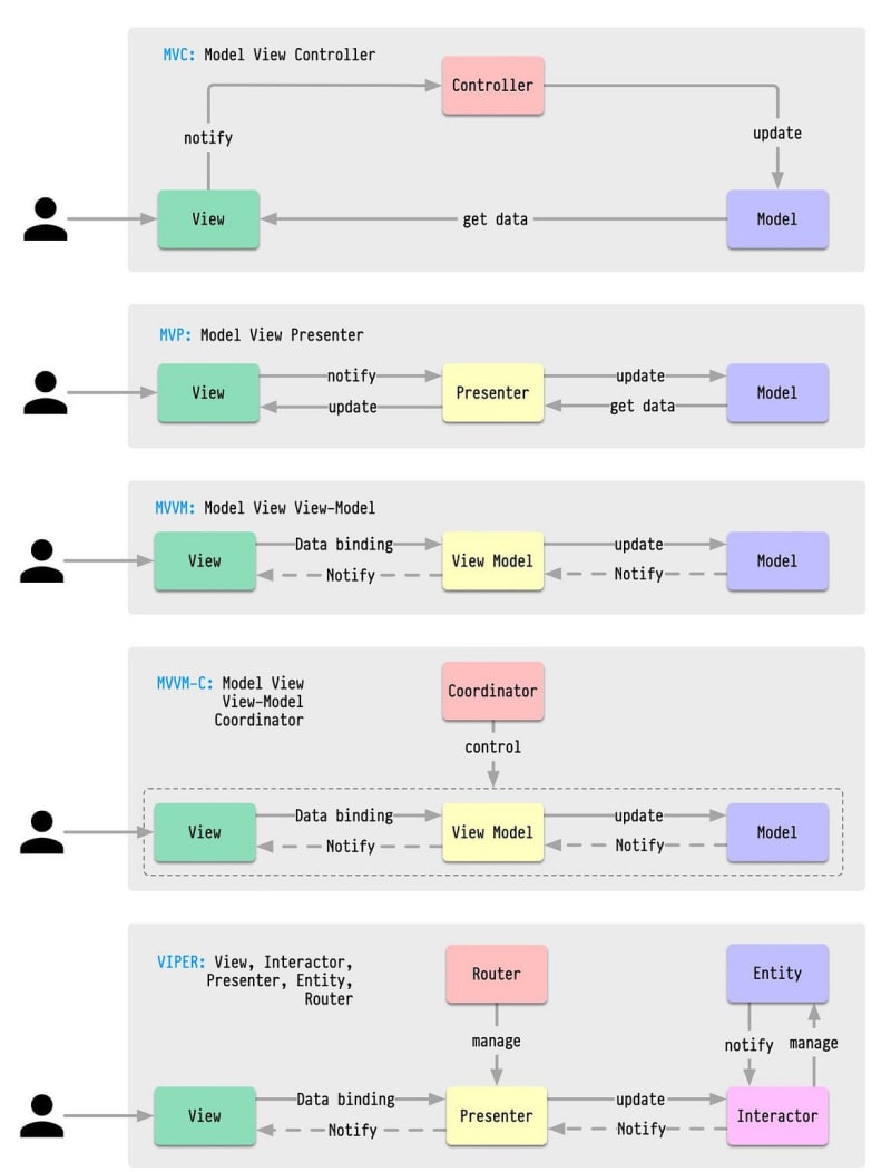 MVC, MVP, MVVM, MVVM-C 및 VIPER 아키텍처 패턴은 각각 특정 애플리케이션 구조를 나타내며, 클린 아키텍처의 원칙을 적용할 수 있습니다.
