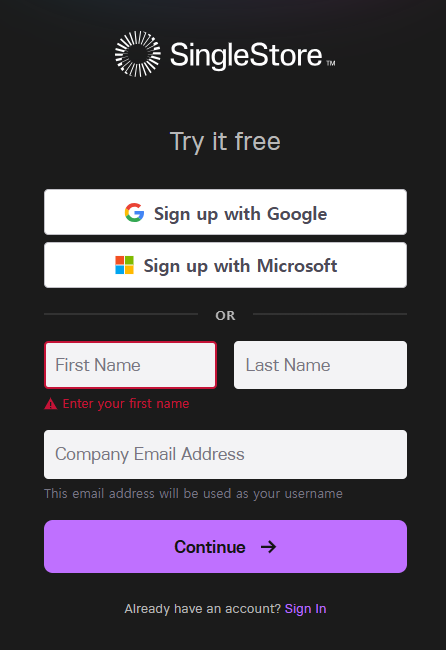 - singlestore 사이트에 접속하여 본문의 "Start Free" 버튼을 선택 합니다.