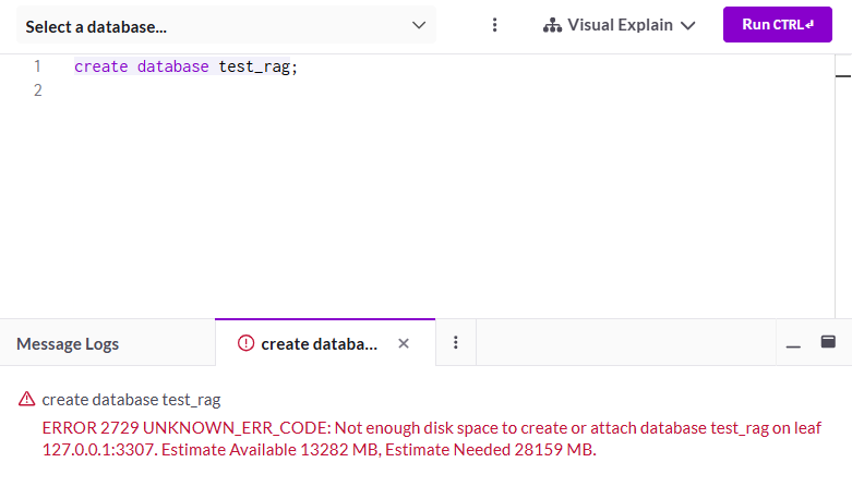 ERROR 2729 UNKNOWN_ERR_CODE: Not enough disk space to create or attach database test_rag on leaf 127.0.0.1:3307. Estimate Available 13282 MB, Estimate Needed 28159 MB.