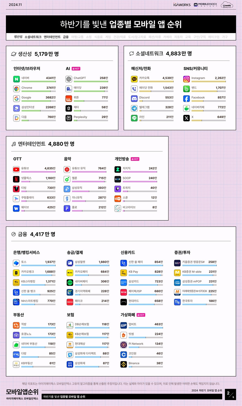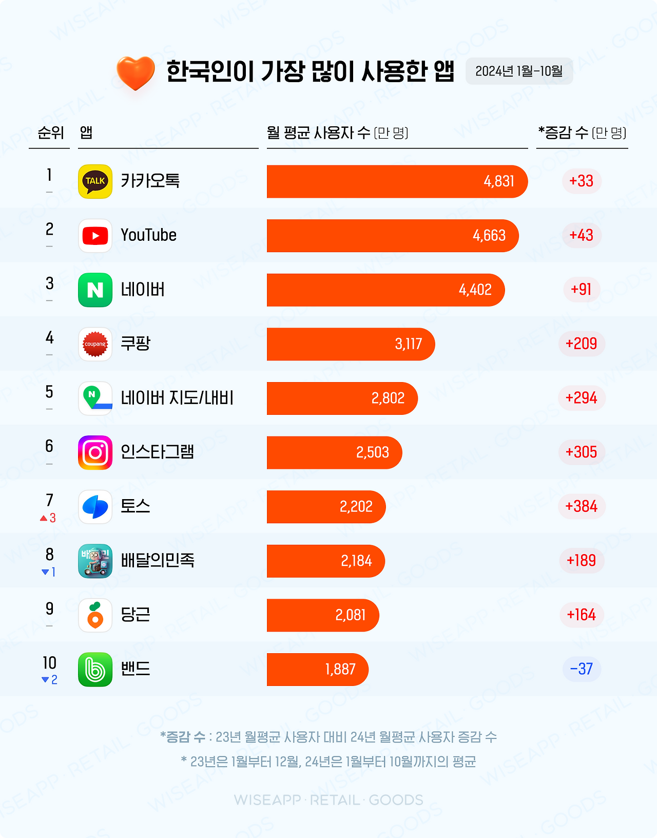 2024년 한국인이 가장 많이 사용한 앱은 카카오톡, 유튜브, 네이버, 쿠팡, 네이버지도/내비, 인스타그램 순