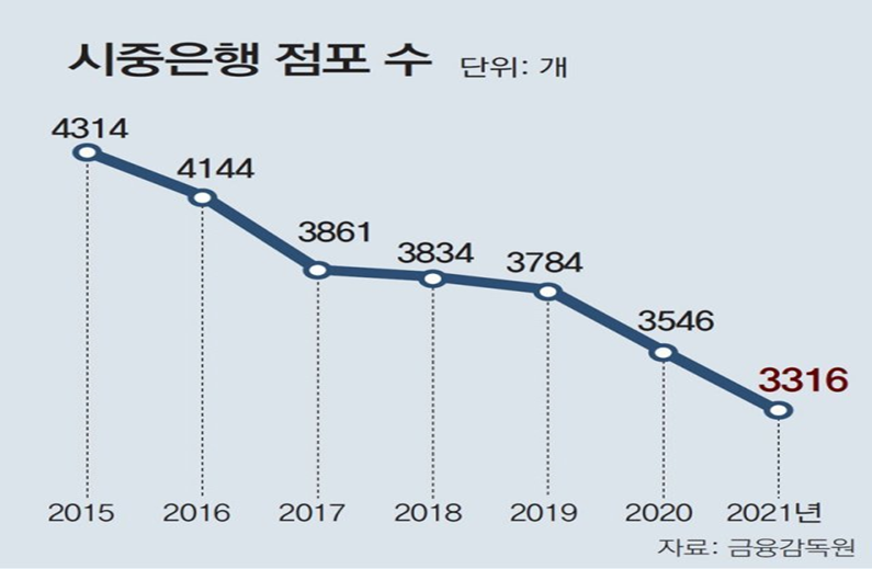 은행업권의 디지털 혁신은 은행 지점 감축과 함께 디지털화가 가속화 되었습니다. 2016년부터 은행점포수는 꾸준하게 줄어들고 있고, 모바일 뱅킹을 통해 은행의 창구를 찾는 고객수는 지속적으로 감소되고 있습니다.