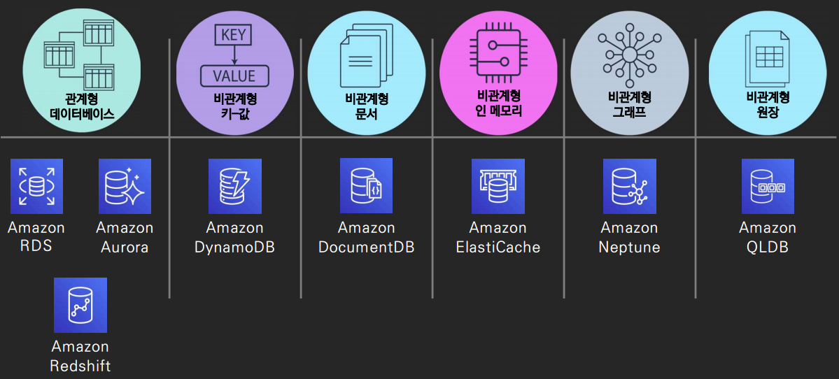 데이터베이스: • Amazon Aurora • Amazon DocumentDB(MongoDB 호환) • Amazon DynamoDB • Amazon DynamoDB Accelerator(DAX) • Amazon ElastiCache • Amazon Keyspaces(for Apache Cassandra) • Amazon Neptune • Amazon Quantum Ledger Database(Amazon QLDB) • Amazon RDS • Amazon Redshift • Amazon Timestream