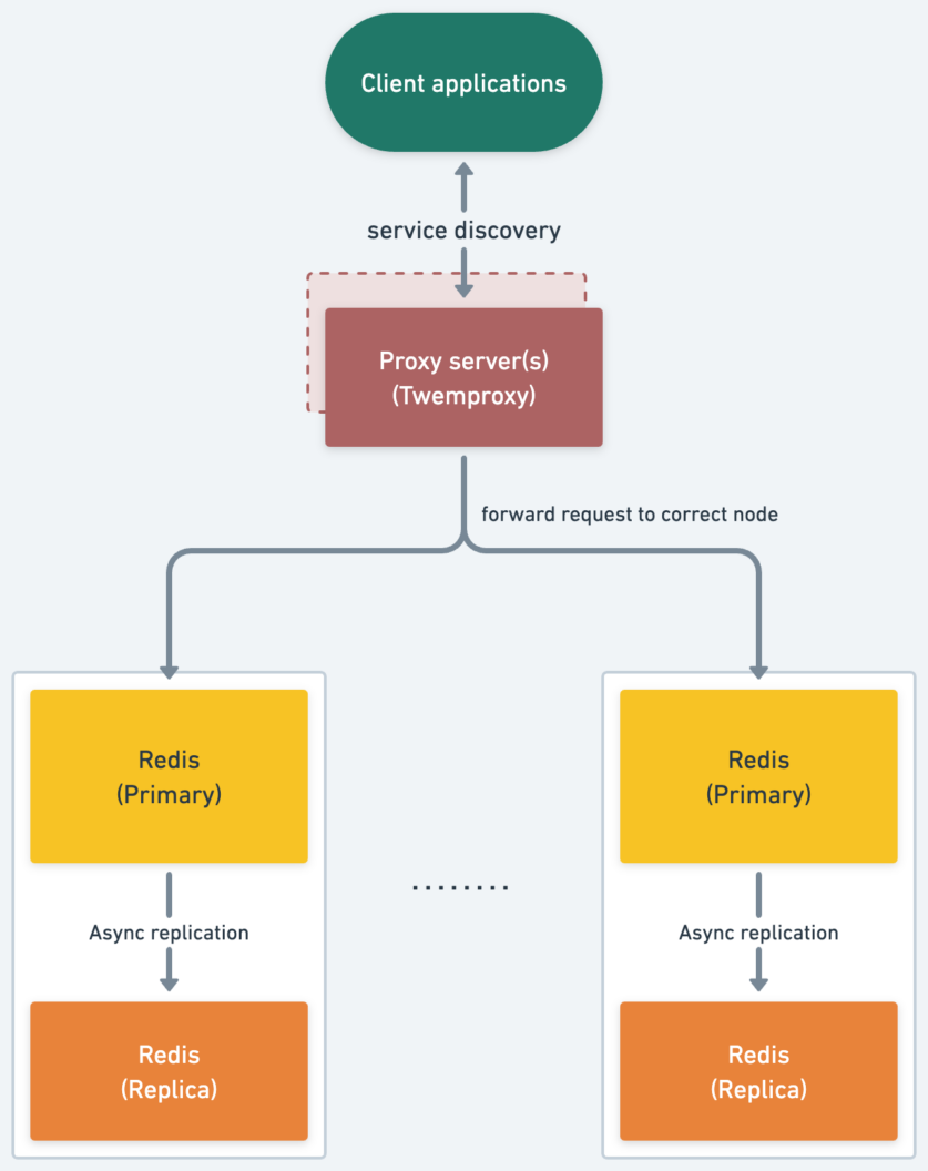프록시 기반 HA 아키텍처는 Redis 클러스터와 Redis Sentinel의 중간쯤에 위치합니다. Sentinel과 마찬가지로, 외부 구성 요소를 사용하여 Redis 서버들을 프런트엔드합니다. 또한 Redis 클러스터처럼 사용자 지정 스키마를 사용하여 데이터 분할을 처리합니다.