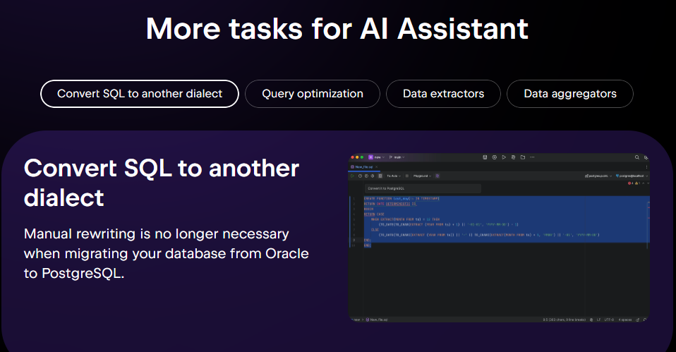 - SQL 코드 자동완성, 리팩토링, 코드 분석 등 “IDE 수준”의 스마트 에디터
