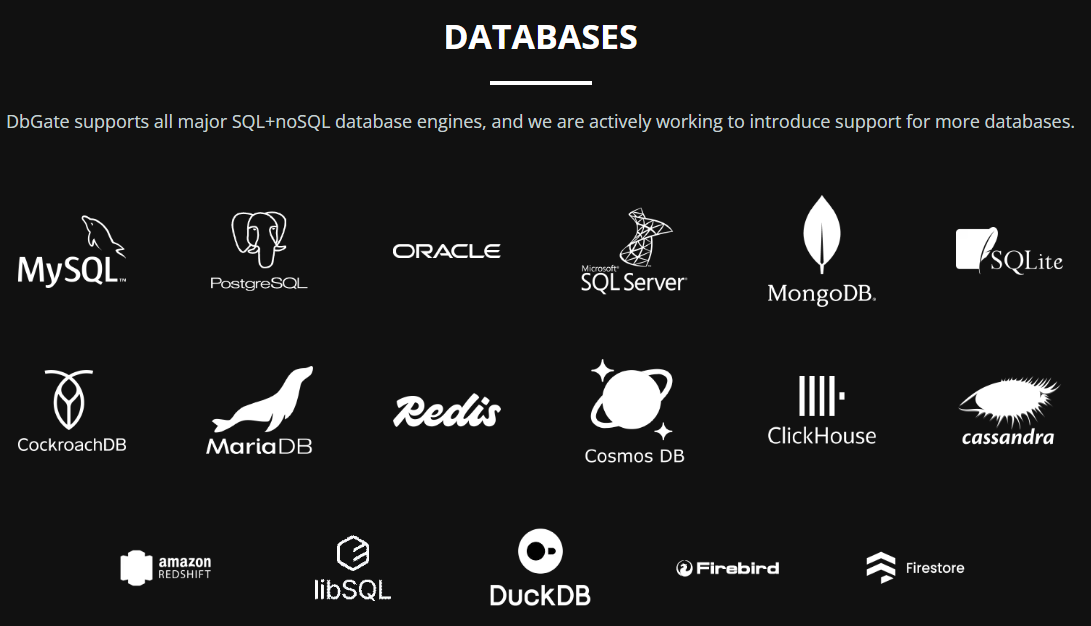 | DbGate | 웹+데스크톱 모두 지원하는 모던 멀티 DB | 멀티 DB, SQL 실행, 대용량 데이터 처리 | 모던 UI, Docker 등 배포 유연, 무료·오픈소스 | 비교적 신생, 일부 기능은 프리미엄 | GitHub 중심 활성, 수치 미공개 | 오픈소스 + 프리미엄 | 무료 + 유료 혼합 |