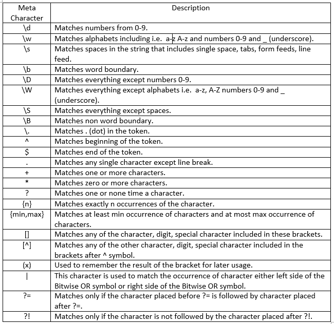 1. 문자를 처리하기 위해 사용한 주요 정규표현식 메타 문자의 설명은 아래와 같습니다.