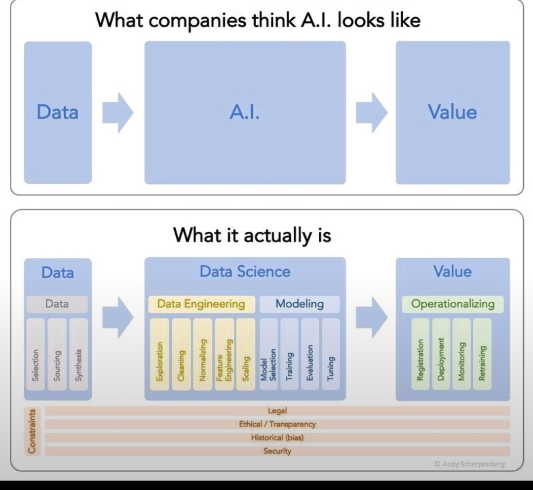 - 기업들은 데이터를 입력하면 곧바로 AI가 작동해 손쉽게 비즈니스 가치(Value)를 창출한다고 여기기 쉽다.
