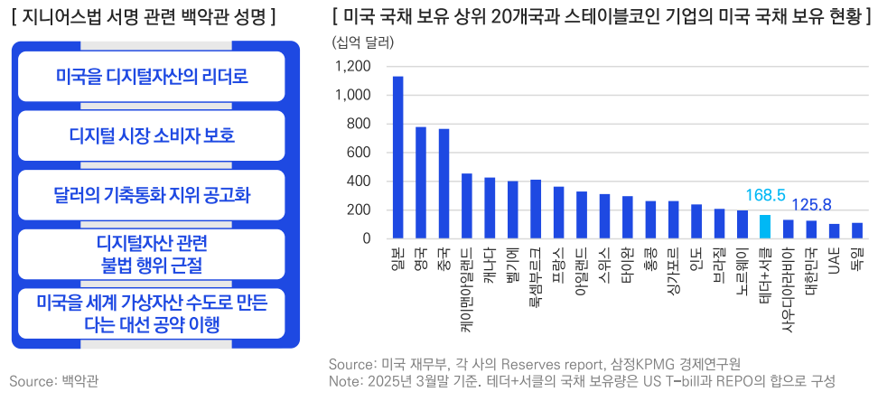 - 미국 GENIUS법: 스테이블코인을 지급 수단으로 법적 인정, 은행 중심 발행 구조로 제도화.