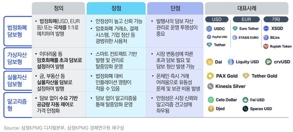 | 가상자산/암호화폐 담보형 | 이더리움 등 암호화폐를 담보로 스마트계약 통해 발행 | DAI (MakerDAO) |